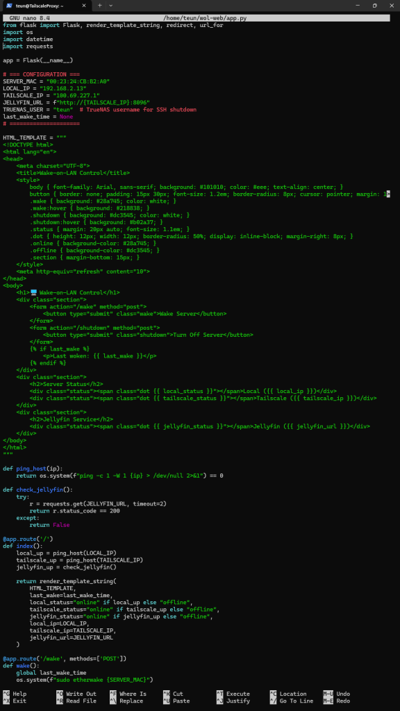 Deze website is op dit moment actief om mij al mijn home servers aan en uit te zetten vanaf waar ik ook ben. Ook laat de site zien of mijn server aan is op mijn local network, tailnet en of mijn jellyfin service actief is.